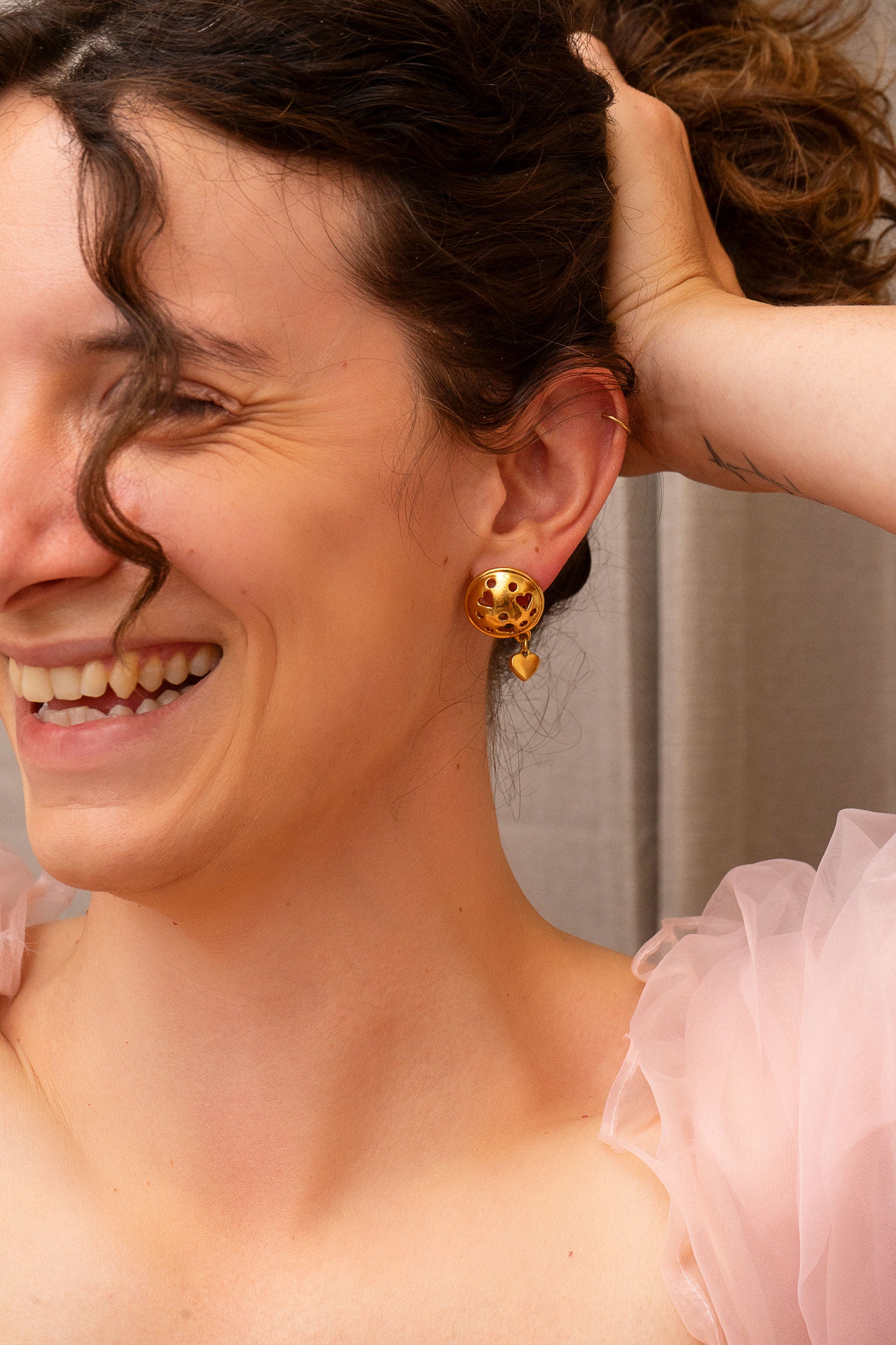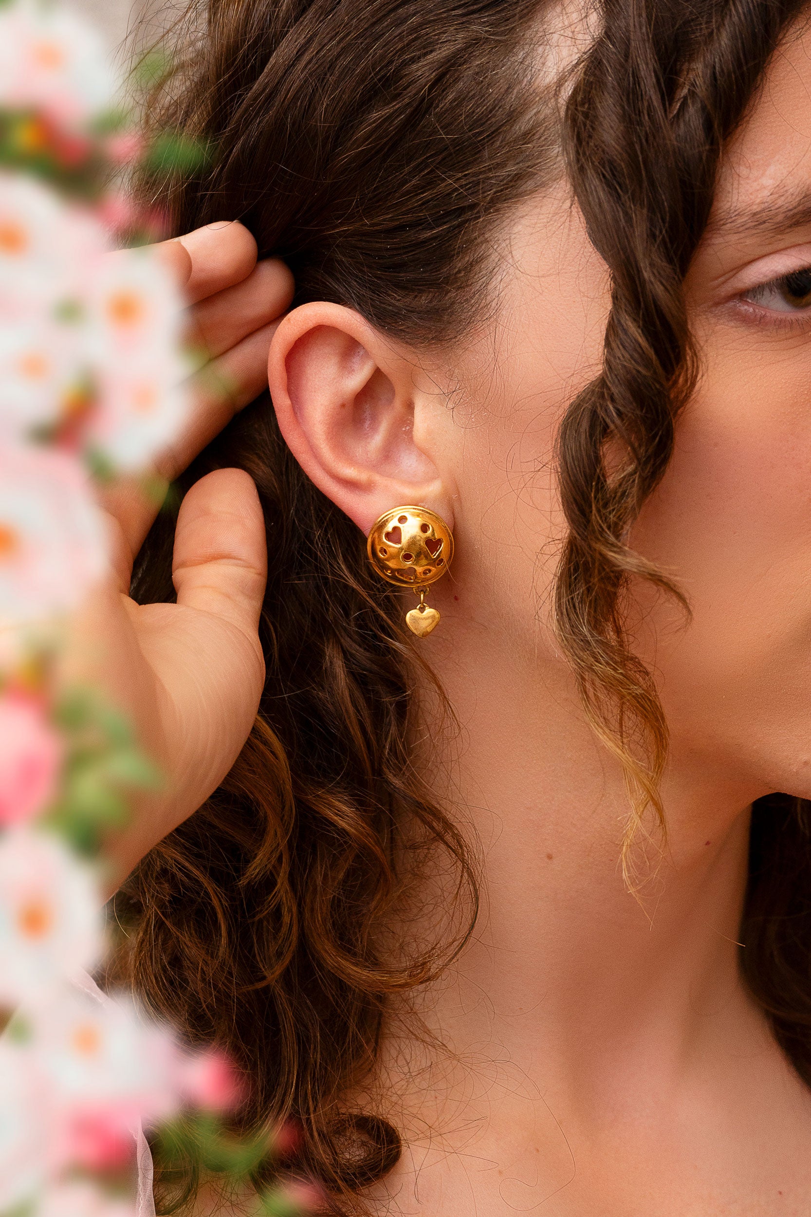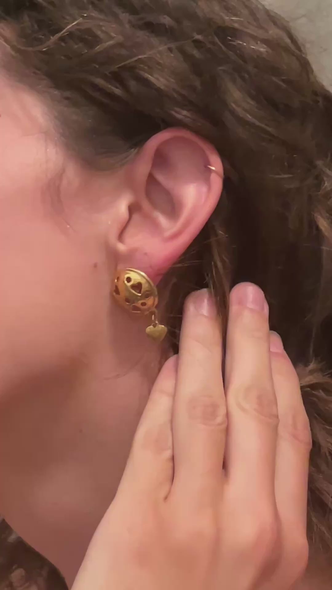 Wear your heart right on your sleeve. Lovely little dome earrings with hearts cut out of the dome with a small heart pendant dangling from it.