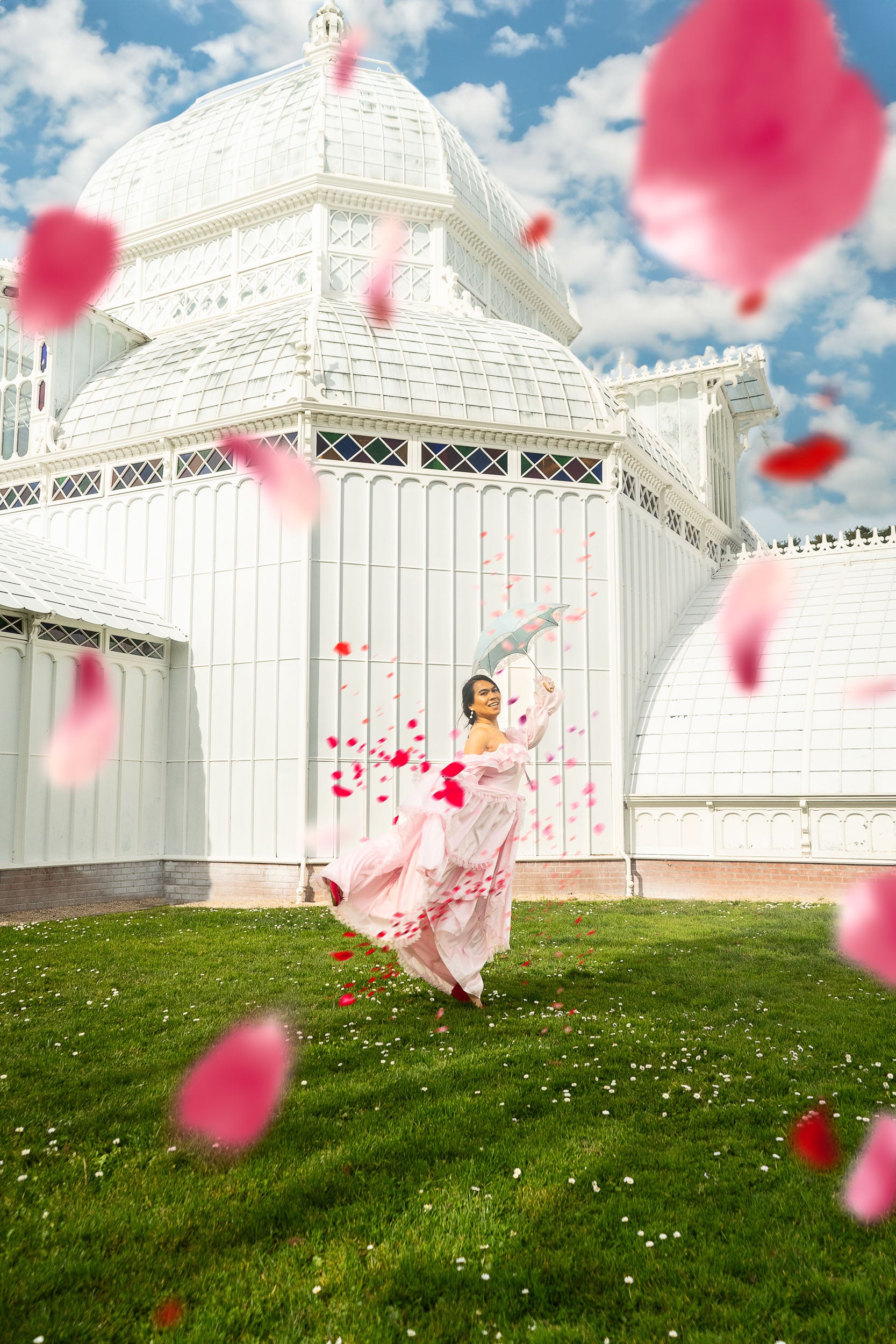 A breathtaking gown of pink taffeta and lace trims, the And Our Label "In The Pink" 5th Anniversary gown commemorates the final form of the And Our model. Beautifully adorned with taffeta bows and elegantly flows with the wearer. This is truly a testament to the ateliers craftsmanship and eye for beauty.