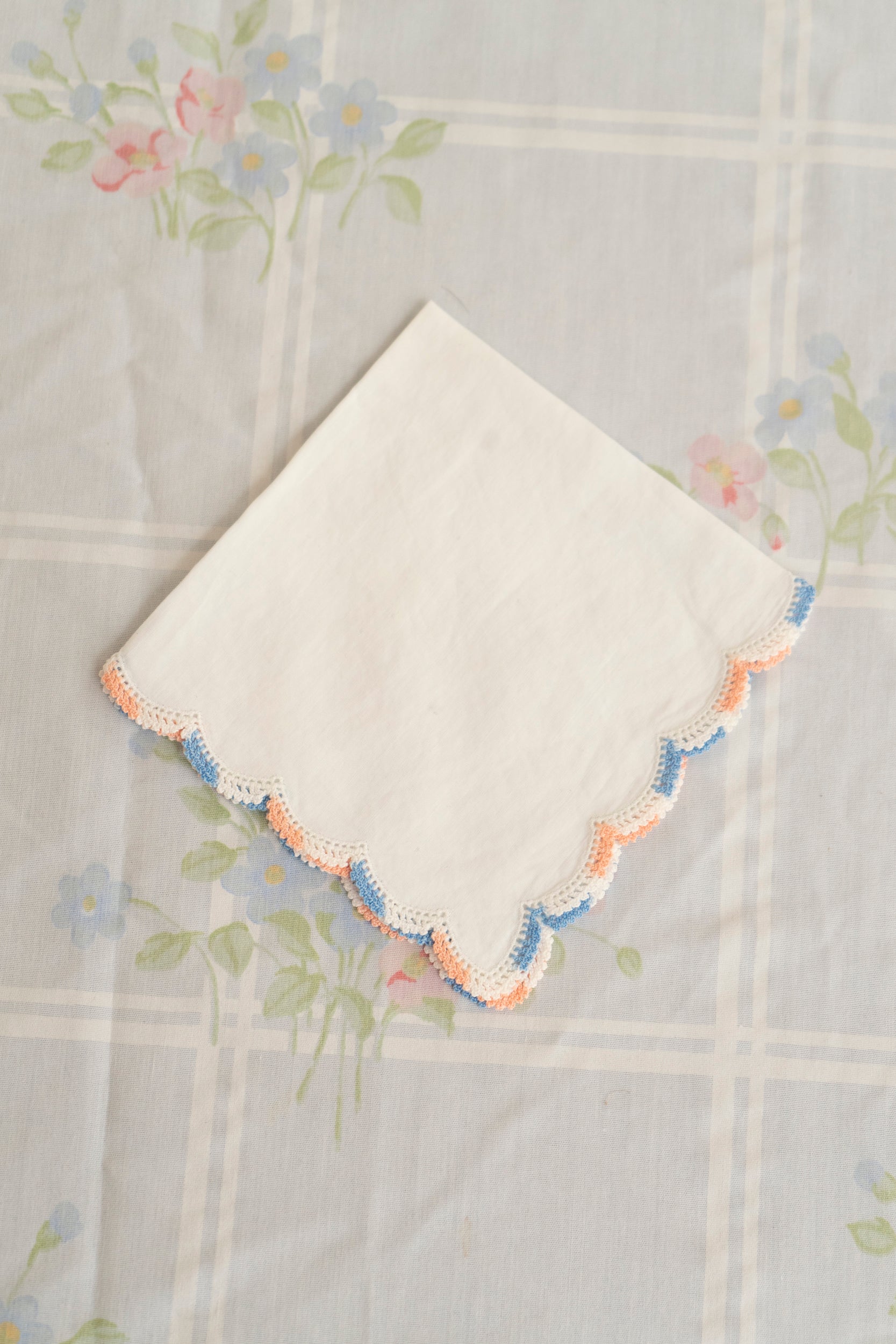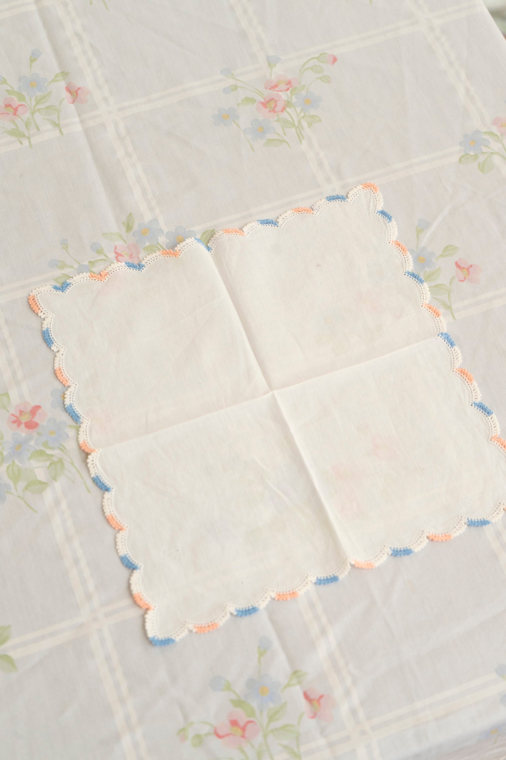 This beautiful 100% linen handkerchief is a 1 of 1 vintage find. It's lined with a delicate blue and pink lace trim and measures at 9x9".