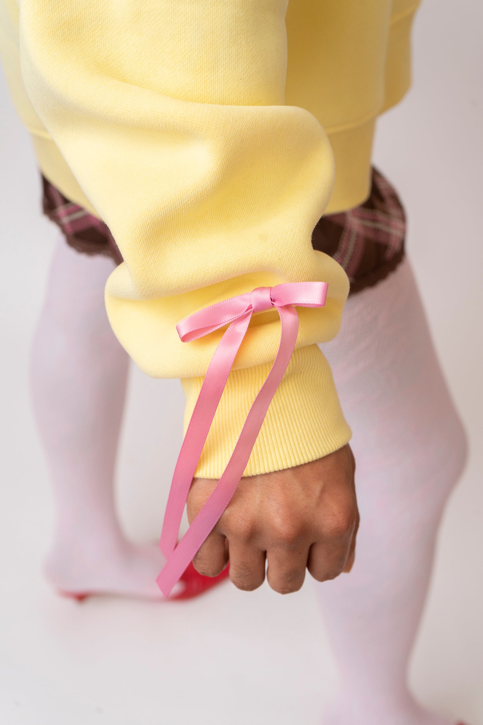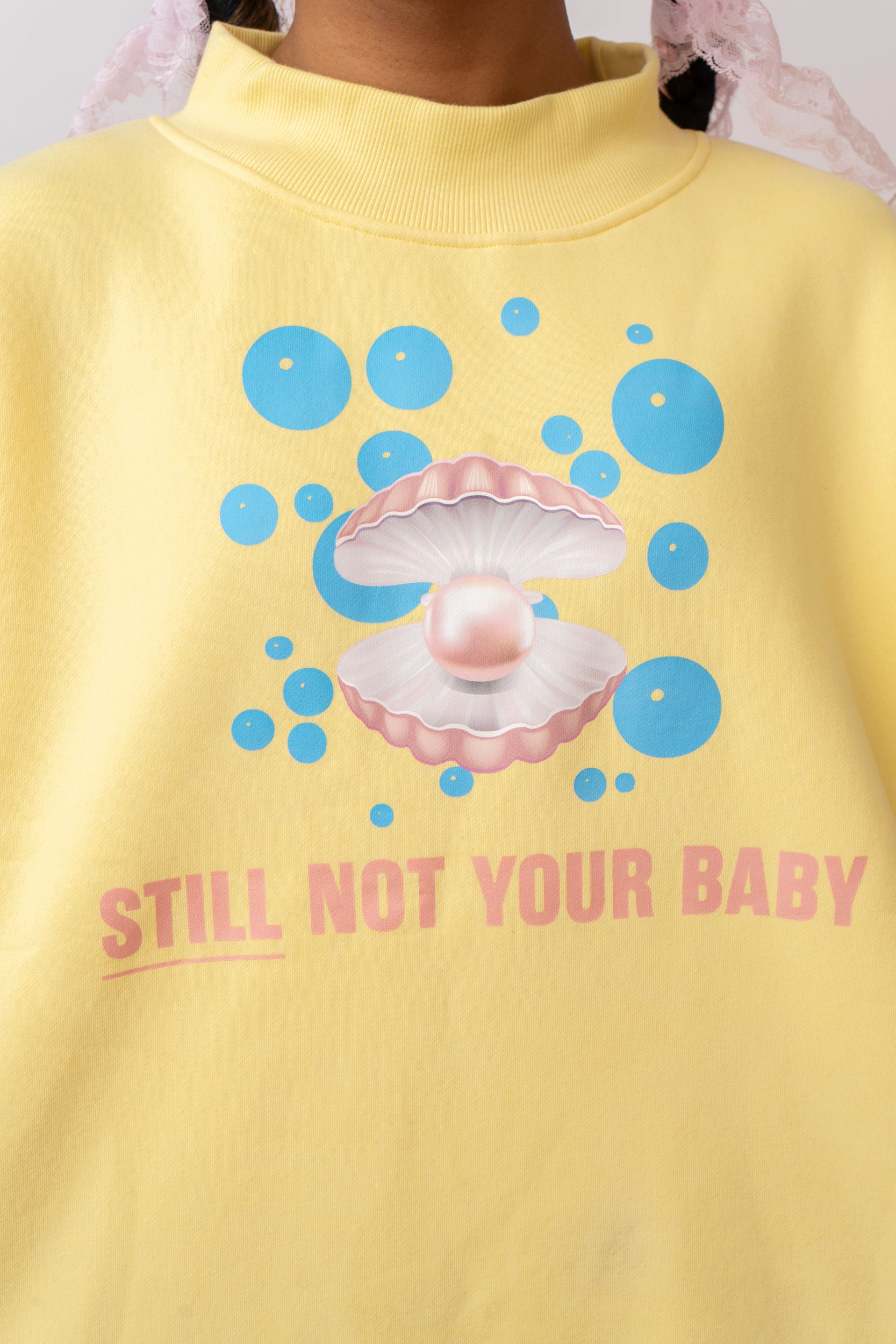 I'm still not your baby. This butter yellow oversized crew sweatshirt is a cozy, Sunday lounging type of piece. Featuring a soft pink clam, pearl with bright blue bubbles, and pink frilly bows on the sleeves.
