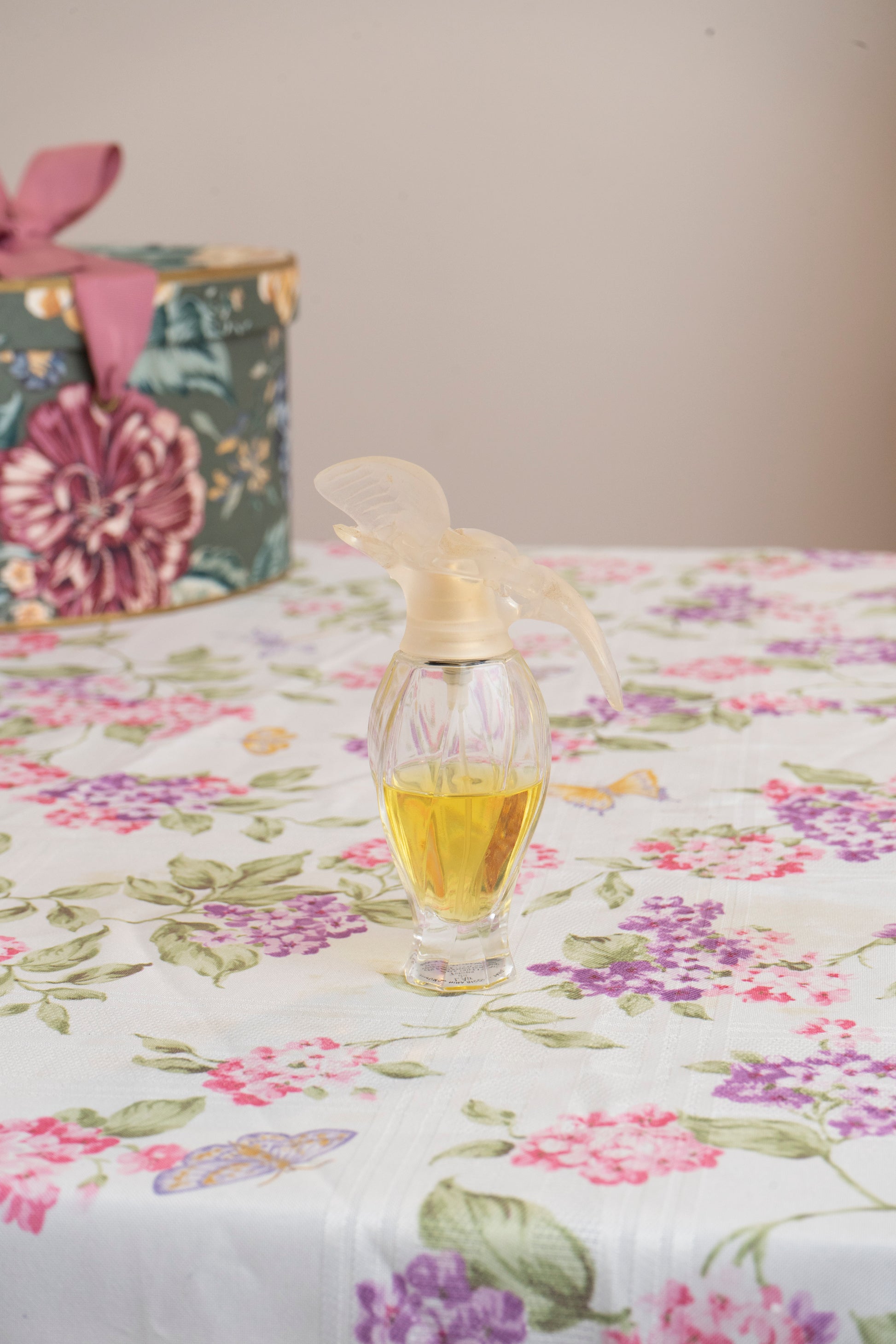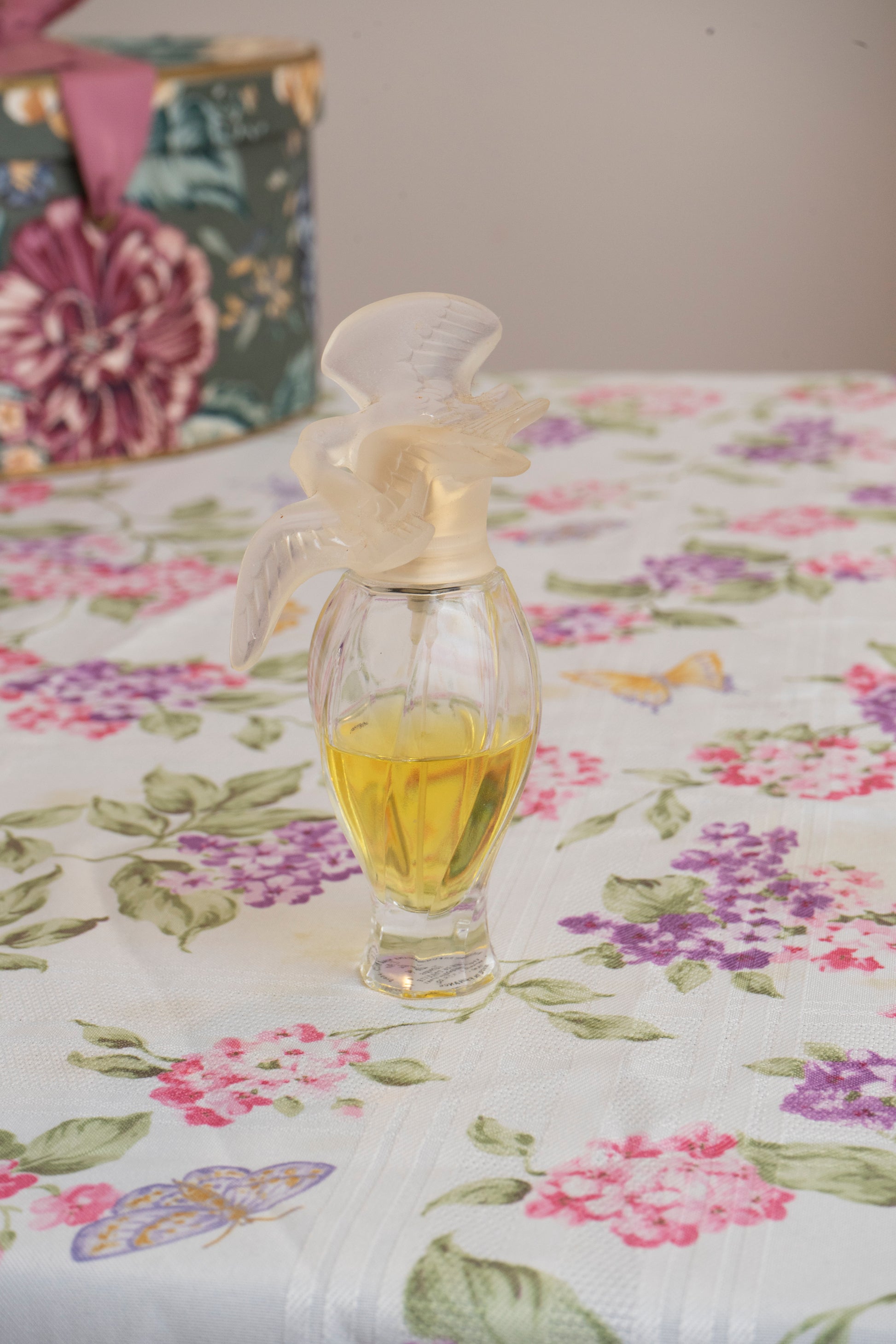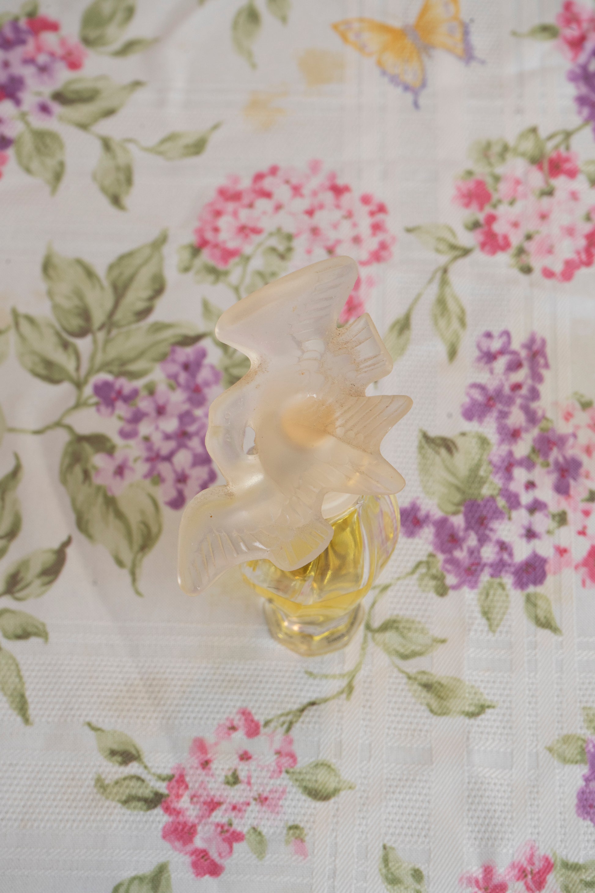 L'Air du Temps is a triumph of bottle art and symbolism: The intertwining doves affectionately termed ‘Les Colombes’, a romantic theme by Marc Lalique, originates from 1951 and came to denote the virginal quality of the visual aspects of its representation, perpetuated in its advertising ever since. Bottle is half full and stands at 6.5". This perfume does not come with a box.